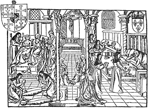 L’hôpital, qui est avant tout l’expression de la charité chrétienne héritée des institutions du Moyen âge et obéissant à la règle de Saint Augustin (par exemple, l’Hôtel Dieu de Paris fondé au VIIème siècle sous l’épiscopat de Saint Landry), reste un lieu où l’on privilégie le spirituel et les soins de l’âme aux soins du corps ; la cause étant la faible médicalisation des lieux et un manque dramatique de médecins. L’hôpital, malgré tout, reçoit toutes les catégories de malades (exceptés certains contagieux) comme les blessés, les aliénés, les accouchées…