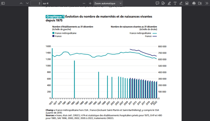 En 2022, selon la DRESS (Direction de la recherche, des études, de l’évaluation et des statistiques), la France compte encore 464 maternités qui disposent de 14 400 lits d’obstétrique et pratiquent 712 800 accouchements en France, y compris au sein du service de santé des armées (SSA) (voir graphique). Mais c’est loin d’être suffisant, autant pour le présent que pour l’avenir, car notre pays devra offrir aux jeunes gens autre chose qu’un engagement dans des forces militaires pour une guerre européenne hypothétique comme promesse d’avenir.